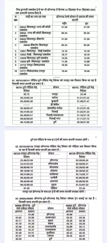नवरात्र में यात्रियों की सुविधा के लिए एक स्पेशल मेमू ट्रेन भी चलाई जाएगी और 2 मेमू ट्रेनों का विस्तार किया गया है। दरअसल, रेलवे प्रशासन हर साल नवरात्रि पर आधा दर्जन से अधिक एक्सप्रेस ट्रेनों को डोंगरगढ़ में स्टापेज की सुविधा देता रहा है। इस बार भी पांच जोड़ी ट्रेनें यानी 10 एक्सप्रेस ट्रेनों का ठहराव 22 सितंबर से 1 अक्टूबर तक सुनिश्चित किया गया है। इन ट्रेनों में बिलासपुर-भगत की कोठी-बिलासपुर, बिलासपुर-बीकानेर-बिलासपुर, बिलासपुर-चेन्नई-बिलासपुर, बिलासपुर-पुणे-बिलासपुर और रायपुर-सिकंदराबाद-रायपुर एक्सप्रेस का स्टापेज 2 मिनट के लिए दिया जाएगा।