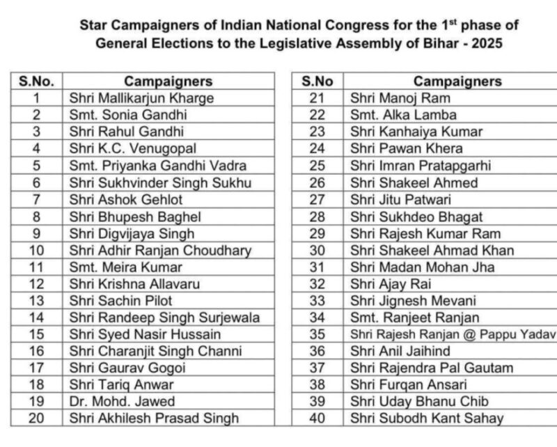 बिहार चुनाव : कांग्रेस ने जारी की 40 स्टार प्रचारकों की लिस्ट, खड़गे, सोनिया, राहुल, प्रियंका, भूपेश समेत कई नेताओं के नाम शामिल, देखें लिस्ट…