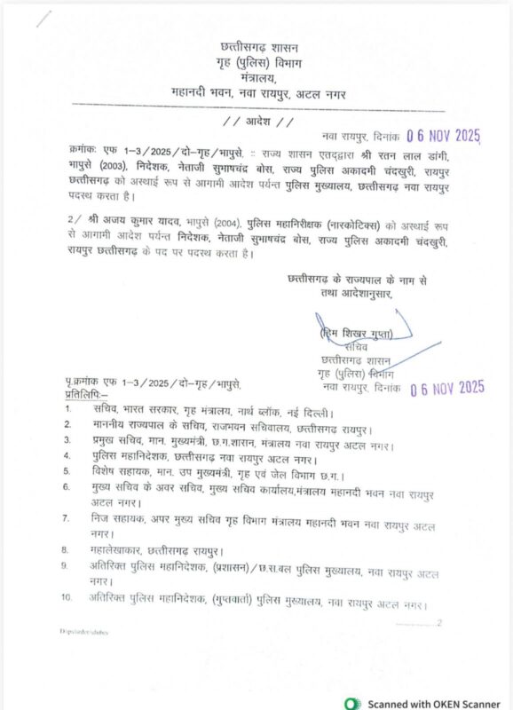 नए आदेश के अनुसार, आईपीएस अजय कुमार यादव, जो फिलहाल रायपुर रेंज में पदस्थ हैं, अब पुलिस अकादमी, चंदखुरी के अतिरिक्त प्रभार निदेशक होंगे। सरकार का यह त्वरित निर्णय विभागीय अनुशासन और शून्य सहिष्णुता नीति का प्रतिबिंब माना जा रहा है।