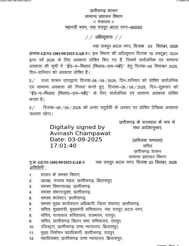 रायपुर। छत्तीसगढ़ में एक और छुट्टी में बदलाव किया गया है। 6 सितंबर की छुट्टी में बदलाव किया गया है। राज्य सरकार ने इस छुट्टी को लेकर अधिसूचना जारी कर दी है। दरअसल 15 अक्टूबर 2024 को अवकाश की सूची जारी की गयी थी। जिसमें 6 सितंबर को शनिवार को अवकाश घोषित कियागया था।