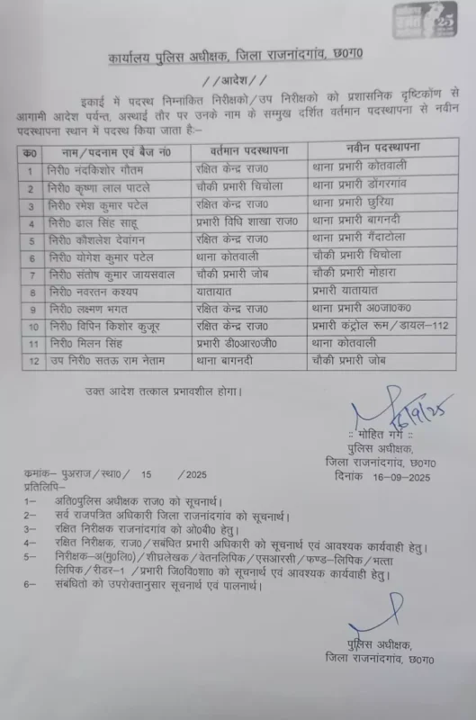 Share Facebook Twitter LinkedIn Pinterest Email Police Transfer राजनांदगांव। राजनांदगांव जिला पुलिस में निरीक्षकों, उप निरीक्षकों के तबादले हुये है। जारी आदेश में 11 निरीक्षक और 1 उप निरीक्षक का नाम शामिल है। देखिए लिस्ट–
