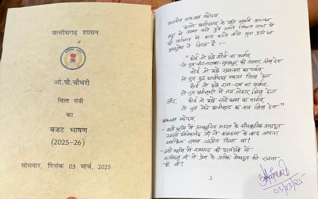 रायपुर: छत्तीसगढ़ विधानसभा में आज ऐतिहासिक क्षण देखने को मिला जब वित्त मंत्री श्री ओपी चौधरी ने हस्तलिखित बजट पेश किया। यह पहला मौका है जब राज्य में कंप्यूटर-टाइप्ड बजट की जगह खुद वित्त मंत्री के हाथों से लिखा गया बजट सदन में प्रस्तुत किया। यह बजट 100 पृष्ठों की है, जिसे पूरी तरह हाथ से लिखा गया है।