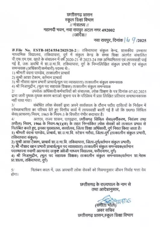 शिकायत के बाद हुई जांच में पाया गया कि नौशाद खान और निजामुद्दीन ने मिलकर करीब 1,84,000 रुपए का गबन किया है। उसी जांच में यह भी सामने आया कि बाद में तकियापारा में पदस्थ हुईं दो महिला प्राचार्य वंदना पांडे व आशा टेकाम ने इस गड़बड़ी की जानकारी होने के बाद भी आपत्ति नहीं की, जिससे उन्हें भी भ्रष्टाचार में शामिल माना गया और निलंबित किया गया। यह मामला छत्तीसगढ़ में शिक्षा विभाग के इतिहास में पहली बार है, जिसमें एक ही शिकायत पर चार लोगों को एक साथ निलंबित किया गया।