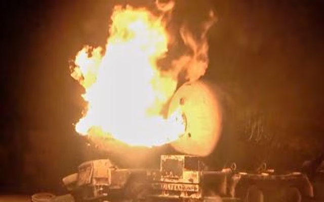 रास ईसा बंदरगाह पर रात में अमेरिकी हवाई हमले के बाद टैंकर ट्रक जलते हुए मलबे में तब्दील हो गए।